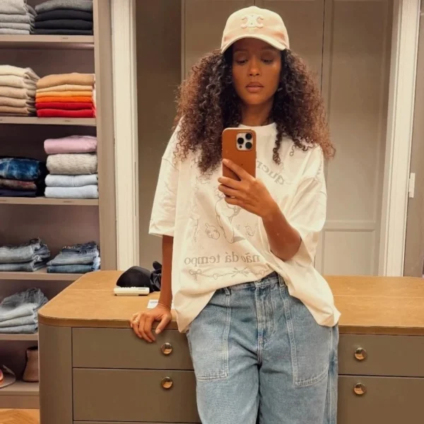 Bruna Marquezine domina o look casual urbano com peças básicas bem escolhidas: jeans reto ou wide leg, camiseta branca de boa gramatura e tênis neutro. O diferencial está no acabamento — óculos escuros marcantes, bolsa estruturada e postura confiante. Nada sobra, nada grita.